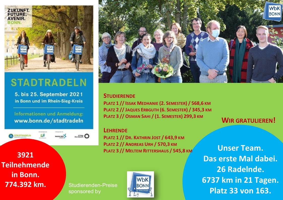 Im September 2021 hat erstmals ein Team aus Studierenden, Lehrenden und nichtlehrendem Personal des Weiterbildungskollegs an der Aktion Stadtradeln teilgenommen. Der deutschlandweite Wettbewerb wird vom Klima-Bündnis organisiert und findet einmal im Jahr statt. Das Ziel: über 21 Tage die eigenen Wege mit dem Fahrrad zurücklegen und mit wenig Aufwand und einem hohen Fitness-Faktor einen Beitrag zum Klimaschutz leisten. Mit viel Ehrgeiz und Spaß ist das 26-köpfige WbK-Team in 21 Tagen 6737 km geradelt und hat Platz 33 von 163 in Bonn erreicht. Dass es 2022 weitergeht, steht schon für viele Mitglieder der Schulgemeinschaft fest!